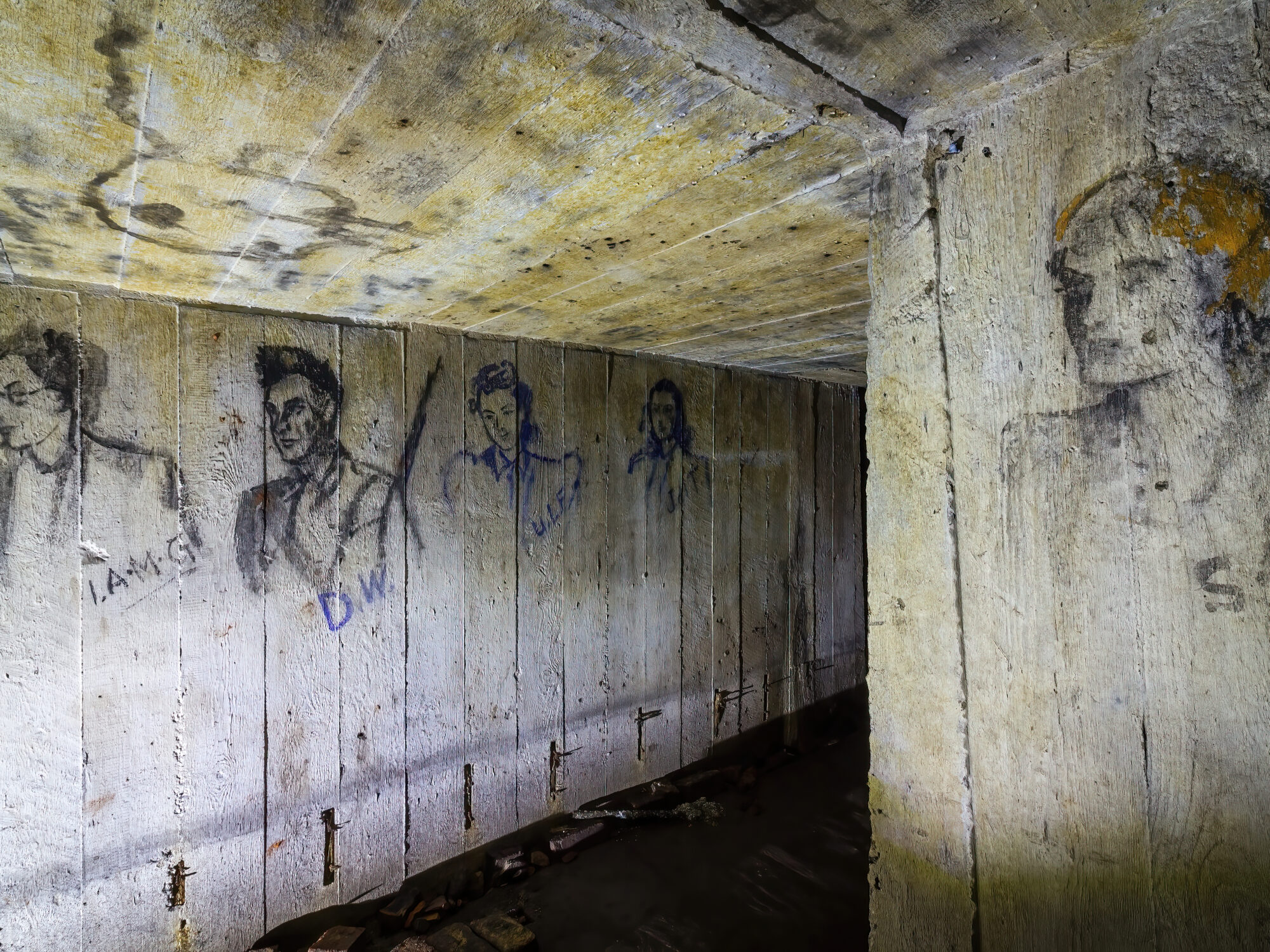 WW2 Bunker with original carvings / drawings from the war. The bunker had a total of 13 entrances which are now filled in and is 300m in length.